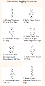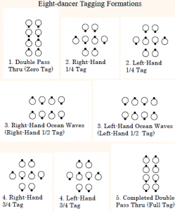 Die ersten vier Tagging-Formationen mit acht Tänzern (d. h. Double Pass Thru, 1/4 Tag, Ocean Waves und 3/4 Tag) und die entsprechenden Tagging-Formationen mit vier Tänzern, die nachstehend beschrieben werden.