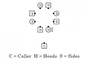 Beschreibung: Die Heads sind die beiden sich einander gegenüber stehenden Paare, die in einem Square zu Beginn eines Tips mit Blickrichtung zum Caller oder von ihm weg stehen. Die Sides sind die beiden sich einander gegenüber stehenden Paare mit der Blickrichtung senkrecht dazu.