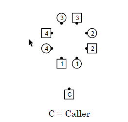 Beschreibung: In einem Squared Set bei Beginn des Tips ist das Paar mit dem Rücken zum Caller das Paar #1. Das Paar zu dessen Rechten (von oben gesehen gegen den Uhrzeigersinn) ist Paar #2, und so weiter.