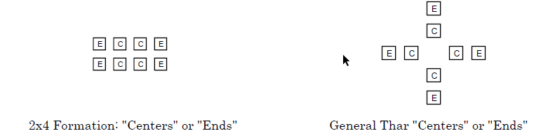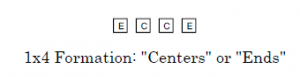 Beschreibung: Tänzer nahe der Mitte des Squares oder der Formation werden Centers genannt. Tänzer auf der Aussenseite des Squares oder der Formation werden Ends genannt. ‚Die Identifikation von Centers oder Ends ist von deren Blickrichtung unabhängig. Centers („C“) und Ends („E“) in einigen üblichen Formationen: