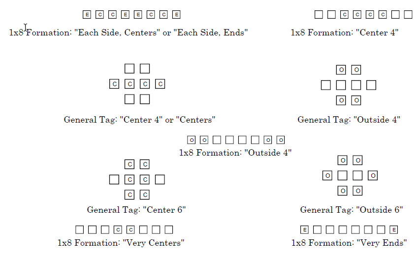 Der Caller sollte die Centers auf jeder Seite („Each side, Centers“) oder die vier Centers („Center 4“) exakt ansprechen, um die Mehrdeutigkeit in einer 1×8-Formation zu vermeiden.